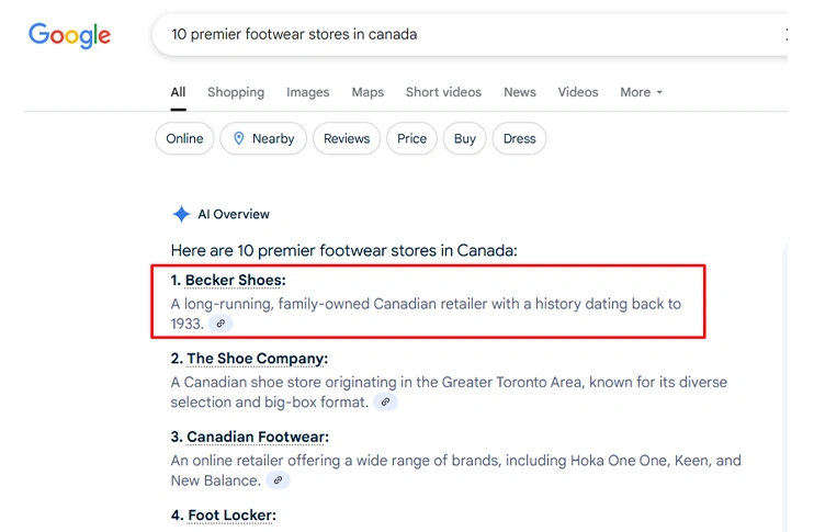 - AEO: Becker Shoes products are showing up on Google AI Overviews and the leading AI chatbots for different shoe categories.